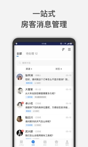 消息页面会展示来自所有房源在所有渠道的咨询信息。除了图文信息,也支持房源的“预准申请”和“订单”卡片。