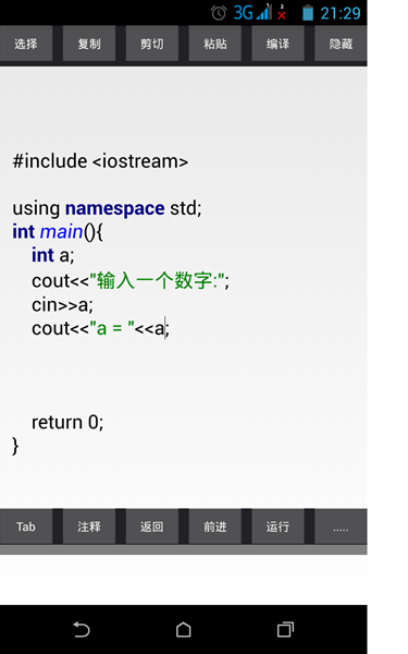 c语言编译器手机版是一款非常方便的c语言代码编辑软件,有了这款软件我们就可以直接在手机上编写代码了。软件的界面和操作面板转为代码编辑而设计,非常清爽,而且功能都一目了然。在这里我们可以使用选择、复制、等基础的编辑功能,然后还有代码常用的Tab和注释功能可以使用。更强大的是我们可以将写好的程序直接在手机上编译运行进行测试或使用,能满足完整的程序编写流程。