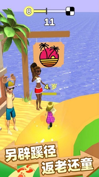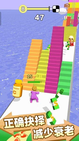 《跑跑时光机》是一款独特的跑酷游戏,玩家扮演的角色会随着游戏进程逐渐变老或变年轻。在复杂的跑道上,你需要躲避危险机关,同时合理使用道具来调整年龄,最终要在寿命耗尽前到达终点才算通关成功。游戏的关卡设计很有意思,阶梯会消耗寿命,所以要尽量选择最矮的阶梯前进。路上有很多有趣的道具,比如可以让你变年轻的健康道具和可能带来麻烦的陷阱,这些都增加了游戏的策略性和趣味性。