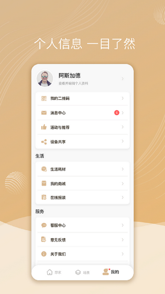 在主菜单点击 I-app_me(我的),您可管理您的账号和地址、收藏音乐,查看 APP 操作信息等。