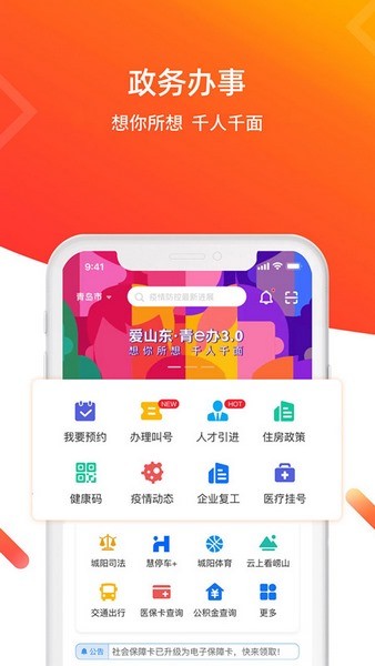 爱山东青e办app是一款专为青岛用户打造的生活服务软件,功能强大又方便实用。它能把各种证件、卡证都装进手机里,比如身份证、驾驶证这些都能放到电子卡包里,出门办事再也不用带一堆东西了。而且很多事情都可以在手机上搞定,像入学报名、社保查询这些都不需要跑腿。