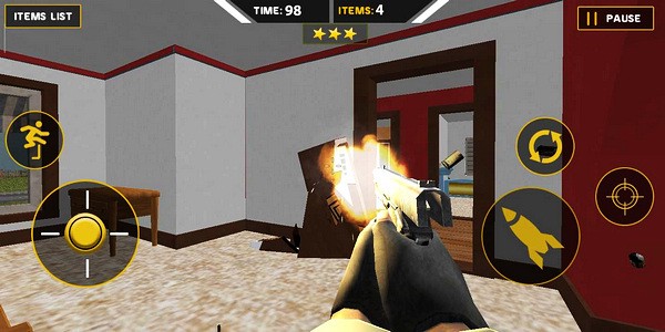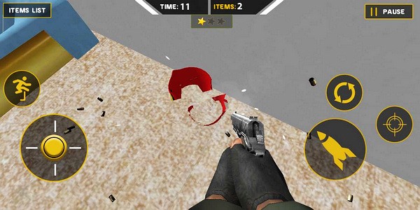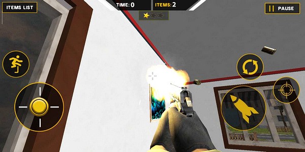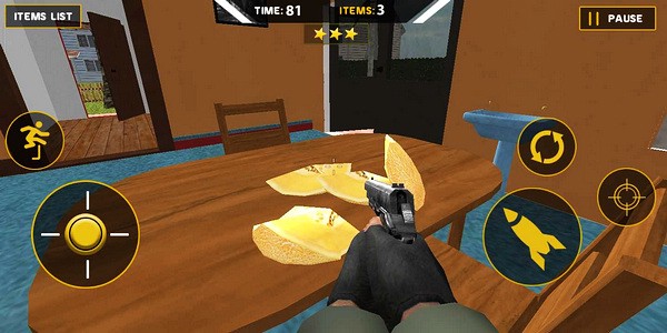 在游戏中,操作玩法非常简单,通过左侧的摇杆控制来移动目标,右侧是切换瞄准与射击的按钮,通过寻找当前关卡内指定的物品,进行搜索与破坏。