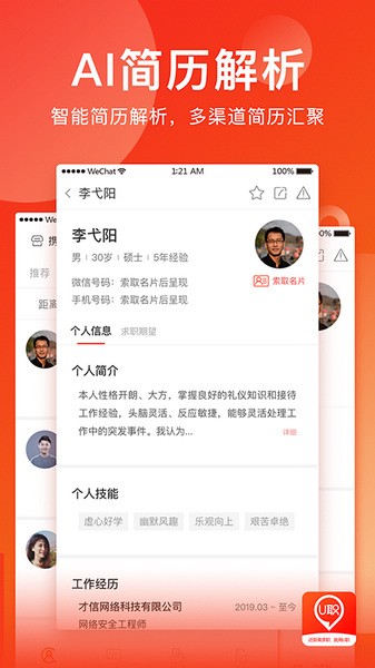 2.通过LBS定位、简历解析、内部推荐、直聊、分享等方式打破时间和空间的阻碍;