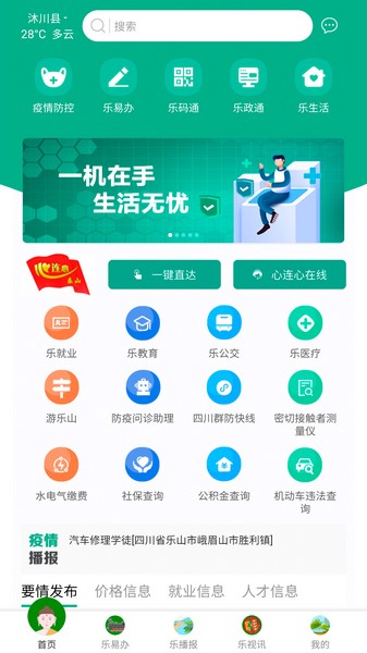 5、云就业服务:接入乐山市人才网和农民工服务网,提供海量招聘信息,开展线上招聘、应聘,满足公众就业需求。