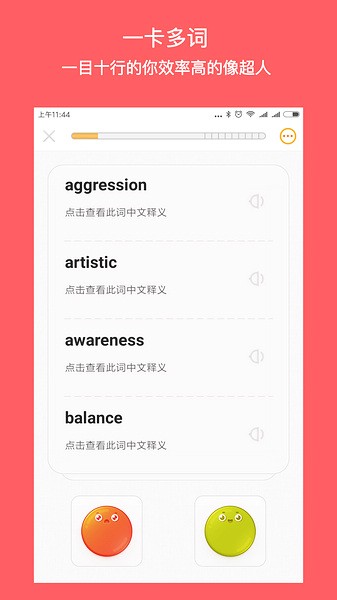 在开启每一轮的复习前,年轮单词会告诉你到目前为止你一共掌握了多少单词。你可以选择所有单词整体回顾一遍,或是只看没有掌握的单词。