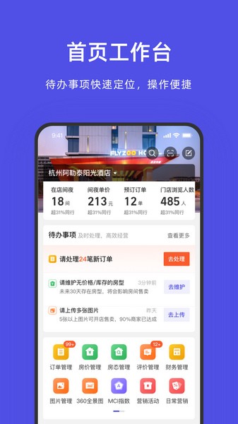 飞猪酒店商家版app是一款专为飞猪酒店上入驻商家准备的便捷办公软件。这款软件可以帮助店铺管理人员轻松快捷地对经营的店铺内容进行管理,对每位客人的订单负责,及时接收客人的要求,为客人提供优质的旅游住宿服务。用户可以在线编辑上传新的商品,对已上架商品进行管理,可以随时查看后台的收款情况,对财务状况做好统计。