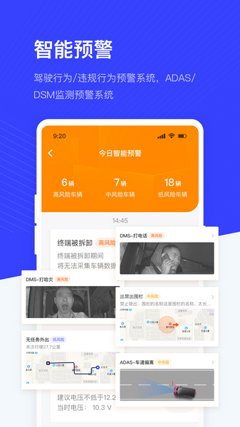 -智能预警,驾驶行为预警系统、违规行为预警系统、ADAS行车预警系统、驾驶人监测系统。