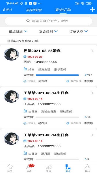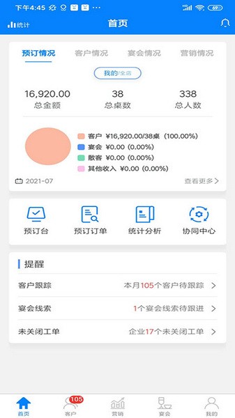 清晰的宴会排班看板,实时了解资源档期 智能分析客户预订情况,自动挖掘线索 宴会信息集中管理,避免遗漏 宴会服务流程标准化,执行人员有序分配