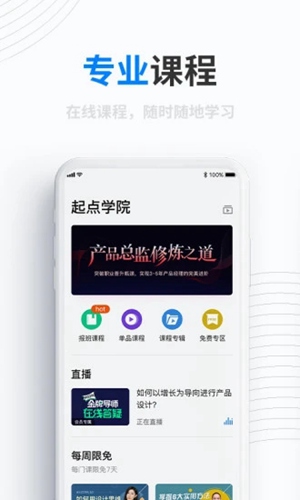 免费课程:每月4期起点学院公开课在线直播课程,邀请BAT一线互联网大咖,围绕产品、运营、交互、数据领域,帮你扩充知识,打开眼界;