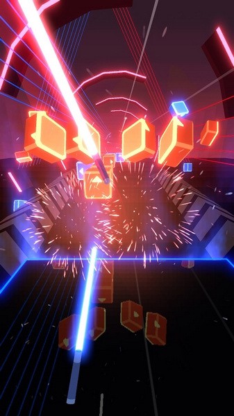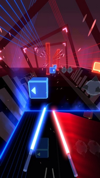 游戏里的特色玩法很多:3D画面第一视角让你身临其境,方块迎面而来的感觉很带感;操作简单,用手指就能轻松切割方块,还能左右手同时使用光剑,必要时还能合并成一把剑。游戏支持自定义曲库,如果你有喜欢的歌单,也可以用来挑战。