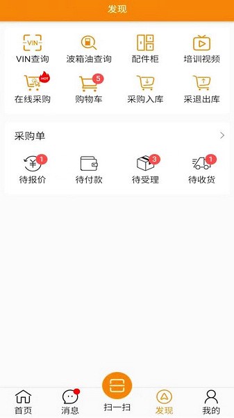 4、进入发现版块,查看各个采购单详细信息,更加便捷的进行采购出入库