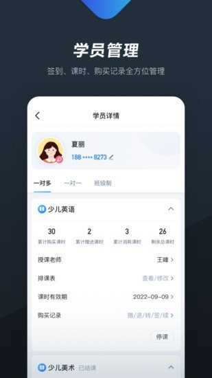 考勤签到: 可在手机上对老师和学员进行签到/调课等操作