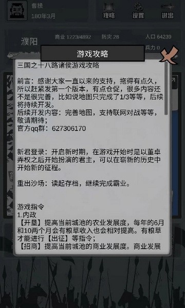 【招商】提高当前城池的商业发展度。商业发展度高,每年的3、6、9、12月份的税收也会提高,有钱才能进行【宴请】、【征兵】等其它的指令;