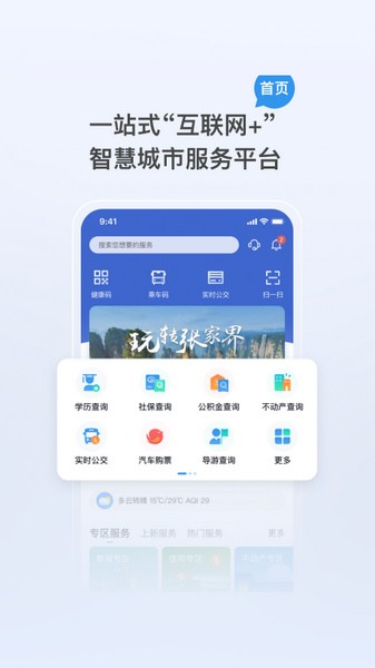 张家界市智慧城市服务平台,支持景区查询、教育缴费、成绩查询、市民互动等功能