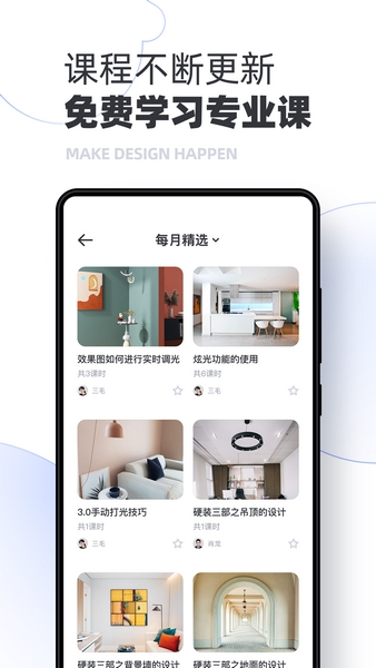 功能方面也挺多的,比如有头条新闻可以看,还有免费直播课程每周都会更新,方便设计师们学习交流。你还能和其他用户分享自己的设计作品,让圈内大佬点评,这样能快速提升水平。软件里还提供很多室内设计课程,不管你是新手还是老手,都能找到适合自己的内容。