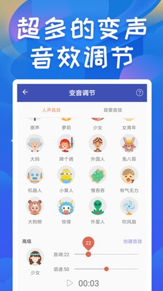 2、多种变声效果可选:爷爷、大叔、小孩、幽灵、机器人...... 变声时只需轻轻一点,让你成为自带BGM的潮人;