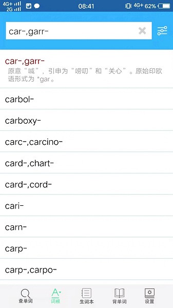 6、词根词缀相当于汉字的偏旁部首,记住常用的词根词缀,可以让你的词汇量快速达到考研、托福、雅思、GRE的水平。APP目前总结两千多条词根,拆解了十万多条包含词根的单词;