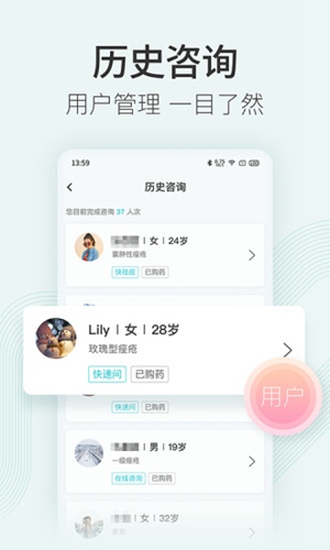 【咨询报告】医生可新增病种,选择药房,添加再次咨询时间,开具药品,可修改咨询报告;【用户管理】已解决皮肤问题的用户咨询记录,回访查看一目了然;