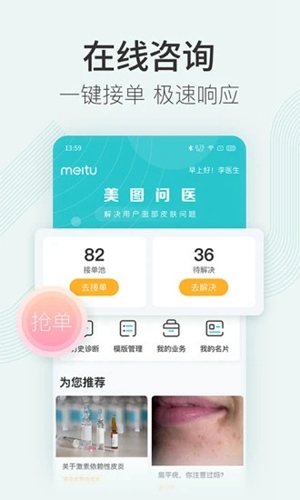美图问医医生APP是一款主打皮肤专科医生在线问诊的软件,界面简洁清爽,功能丰富强大,面向全国汇集海量咨询订单,一键随心接单,为患者提供在线问诊服务,并支持通过图、文、语音形似进行沟通,帮助医生更好的在线诊断患者问题,并给出相应的护理建议,让患者更满意,同时软件还搭配了各种皮肤健康百科及护理建议模板,方便医生快速编辑回复,让办公更轻松!