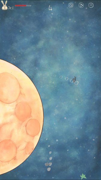 这个游戏看起来挺有意思的,两只小兔子在月球上转圈的画面应该很治愈吧?操作很简单,就是控制一只兔子一直跑圈,圈数越多分数越高。不过要注意生命值,要是被扣光了游戏就结束了,所以得想办法让两兔相遇来续命。