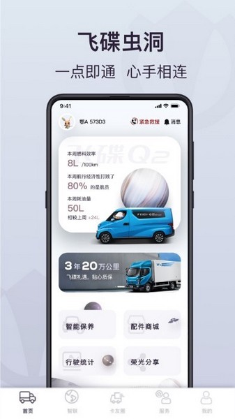 司机可通过飞碟虫洞APP实时查询车辆行驶情况,预约保养服务;