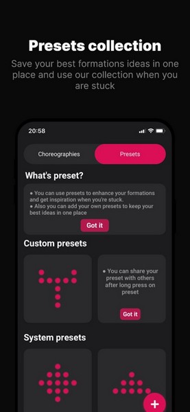 这个app功能挺强大的,比如可以撤销操作、给每个位置加评论、同步音乐节拍,还能给舞者起名字并调颜色,甚至可以把最佳方案存进预设集合里。界面设计得很简单直观,完全不用担心上手难。特别是新版本还增加了各种背景选择,像是篮球场、啦啦队垫这些都能选,用来规划阵型更方便了。
