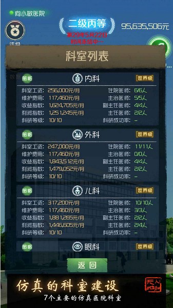 4、后期的世界级科室每个科室2到3名主任医师,逐个升到10次满级,定级治愈率的提高会大幅度增加收入指数。