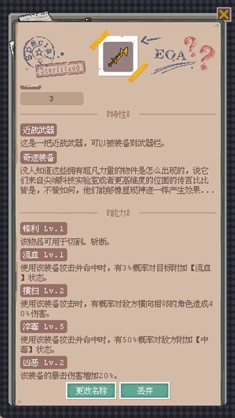 神器:神器是一种特殊装备的总称,代表着游戏内的一类特殊装备,这类装备要么拥有惊人的属性,要么拥有一些特殊效果,比如【贪食背包】会增加大量的背包空间,但它会随机吃掉背包里的食物;【无名之剑】会根据玩家为其设定的名字变换属性;【天火】在射击后无需任何子弹即可重新装填;【妖刀村正】每次杀死敌人后其属性都会增长。
