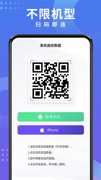手机数据克隆官方免费版app是一款超级好用的数据克隆软件,在这里,不但支持数据迁移,只要机不离手即可轻松一键同步手机数据,同时你也可以通过二维码建立有效连接,让你的数据克隆更加方便快捷,而且不需要联网,也不用连接电脑,让你直接摆脱数据线,各种手机数据一键快速发送,并且支持20米以内进场直连,数据传输速度远远超过蓝牙传输。