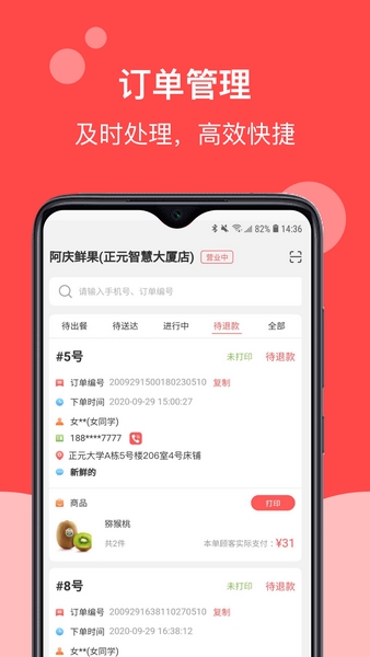 4、订单状态查询,订单的出餐、配送和退款等最新状态可以一目了然;