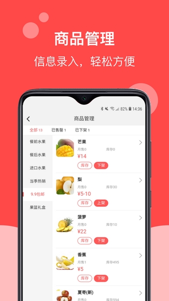 帅店是一款专为校园周边商家打造的管理软件,如果想要更加高效快速的管理门店,那么不如使用这款软件来助你一臂之力吧!其可会支持快速管理门店数据,每当有新订单时,都会及时记录提醒,且所有数据清晰罗列,满足你的使用需求!同时商户还能随时随地上下架各种产品,无论是水果、零食,还是其他外卖等都能快速上架,满足不同商家的使用需求!