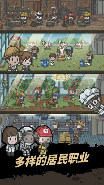 游戏特色鲜明:在核战争后的废墟中求生,探索未知世界,寻找资源并建设安全的避难所。玩家需要管理居民幸福度、布局设施(如发电室、宿舍、餐厅等),同时研发装备和生产物资。新手可以通过引导熟悉玩法,选择适合的角色进行探险。