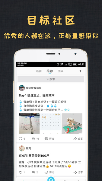 发起目标:发起一个目标,平台的其他用户也会加入对你目标的关注和监督,你也可以邀请你的好友来监督你。