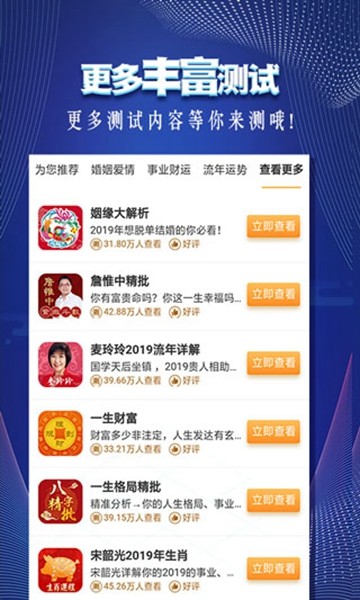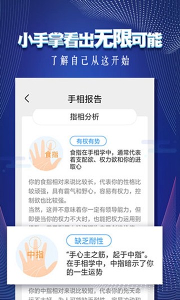 4、【看个性命运】看手相,查性格控制命运,指相反映性格:支配欲,权力欲和进取心,隐藏在你掌中性格秘密逐一揭晓;智慧线将反映你理财观念、情感态度、思维模式的指纹语言逐个翻译,全方位了解自己。