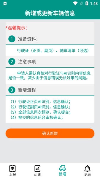 若通过车牌颜色、号牌号码、车架号后8位无法查询到车辆信息的,可通过新增”功能对行驶证正页、副页识别新增车辆信息,待人工核查信息后,完成信息的添加。
