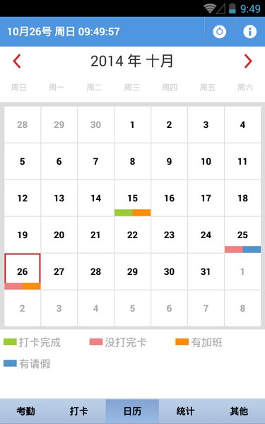 5、【日历显示】:以日历方式显示各种信息,统计的考勤一目了然,所有的工作状态都能看得清清楚楚