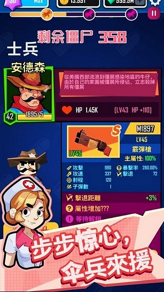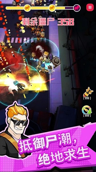 游戏操作起来非常流畅,玩家仅凭一根手指便可轻松操作,这里不仅有着炫酷的技能特效和打击效果,还有数十位不同能力的幸存者联盟成员急需玩家的解锁和使用,不同的角色对应武器的使用能力不同,如突击兵杰瑞,武器代表分别是MP5和UMP9;西部牛仔安德森,武器代表是M1887和M870,攻击方式以一定频率发射子弹,优先攻击最近的敌人,扇形范围攻击。类似的成员武器和攻击方式各有不同,具体挑战场景可根据实际需要进行调整。