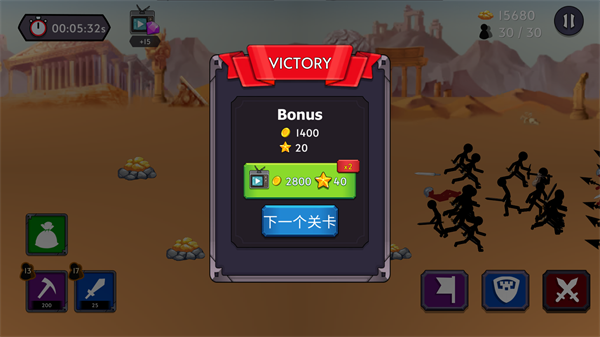 玩家完成的每个级别都将获得硬币数量来升级他们的火柴人军队。