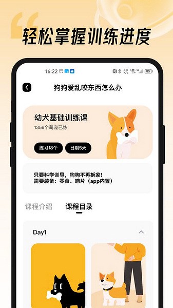 软件里有海量练习教程,图文加视频演示,特别直观。而且还能根据宠物的特点智能定制训练方案,这也太专业了吧!每天还有日程提醒,轻松掌握训练进度。内置的电子响片和犬笛也超级实用,简直就是训练工具库。