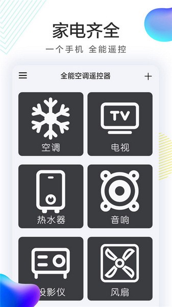 【家电齐全】:本APP是空调、电视、热水器、音响、投影仪、风扇。它几乎涵盖了您需要的所有设备!