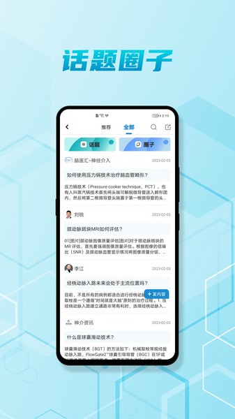 为神经外科、神经介入医生提供一个可自己上传病例的平台,医生可自行上传临床医学病例相关的CT和MRI图片、医学视频、文献,邀请同行进行评论互动和学习交流。
