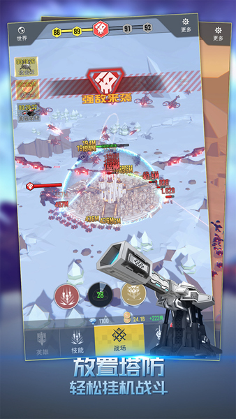 3、你将升级、晋升防御要塞的每一座炮塔,攻击不断涌上前来的机械敌人,阻止它们进攻城池。