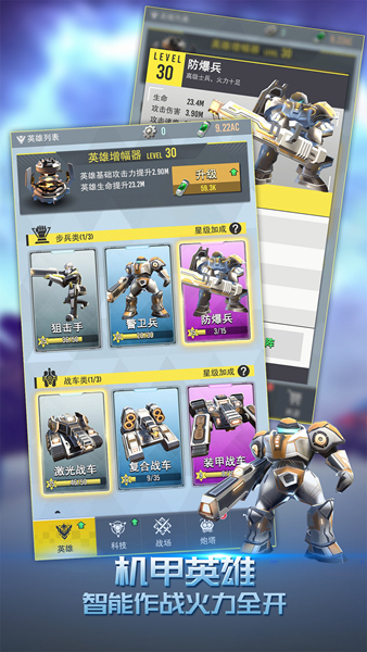 游戏中还有许多特色,比如提升武器装备、加入不同兵种获取 BUFF 奖金等。当你变强后,可以挑战强大的 BOSS 并获得更多资源。玩法方面,包括爽快的操作、挂机也能收益、精致的画面体验等。游戏画面充满未来科幻感,玩家可以建造堡垒,收集养成机甲英雄,并根据敌人特性调整策略。