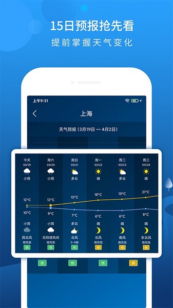1、手机天气预报提供完备的天气信息:15日天气预报、24小时天气预报、空气质量指数、空气污染指数、pm2.5、风力、湿度、温度、日出日落、气压、能见度等