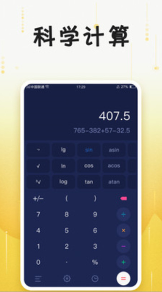 【科学计算器】支持对数函数、三角函数、绝对值、反三角函数、阶乘、随机数、最大值最小值、开方、定积分、导函数、排列组合、最大最小公约数等函数算法和常量算法;