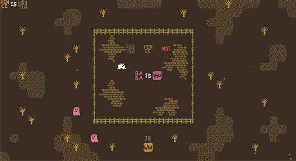 2、后来你能看到有关这个“规则”的各种变种,比如双层地图、用箱子填坑、单纯推出通路等等,场景中“baba is you”、“rock is push”、“flag is win”这些句子其实就是当前关卡的一个规则设定。