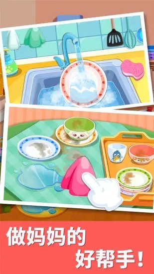 除了基本的家务活动,宝宝大扫除还包含了洗碗、洗衣等更为细致的生活技能教学。在自己动手学洗碗环节中,孩子们可以学习到正确的洗碗步骤,包括清除残渣、涂抹洗洁精、冲洗干净以及最后的晾干过程。每个环节都有清晰的指引,确保孩子们能够轻松上手并享受乐趣。游戏的操作界面简洁明了,配合温馨的画风和可爱的卡通角色,极大地提升了孩子们的学习兴趣。通过这些精心设计的任务,孩子们不仅能够在游戏中获得成就感,还能在现实生活中模仿实践,逐渐形成良好的生活习惯。