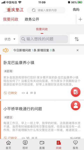 3.平台拥有新闻,视听,直播,问政,服务等内容板块,可以帮助更好的引导及服务垫江;