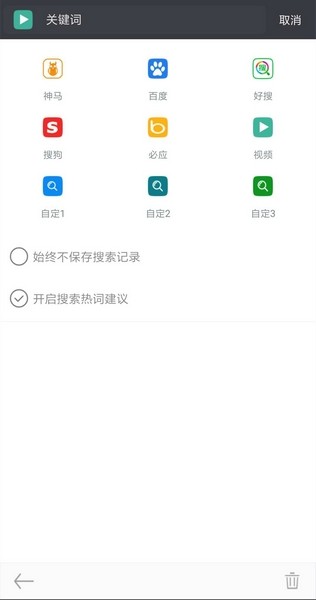当你在搜索框输入关键词,会自动触发提示相关的关键词搜索,默认的搜索引擎是神马搜索,广告少点,搜索结果可能比某度还是要差点,你在搜索框可以通过长按来修改默认的搜索引擎,也可自定义。