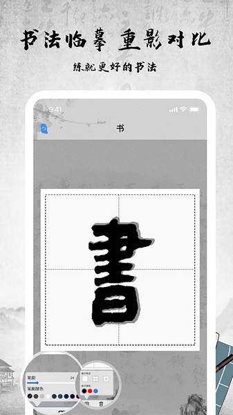 重影比对:通过手机拍照自己的临字,然后跟碑帖上范字重影比对,一目了然的找出差距,不断改进、不断提高。